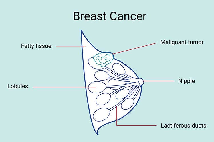 Breast cancer can begin in any part of the breast. It occurs when malignant (cancerous) cells grow and multiply out of control. The breast is made up of lobules and ducts.