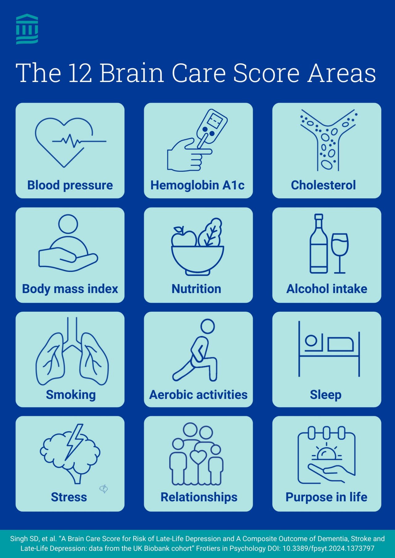 The Brain Care Score evaluates 12 modifiable factors that influence brain health: